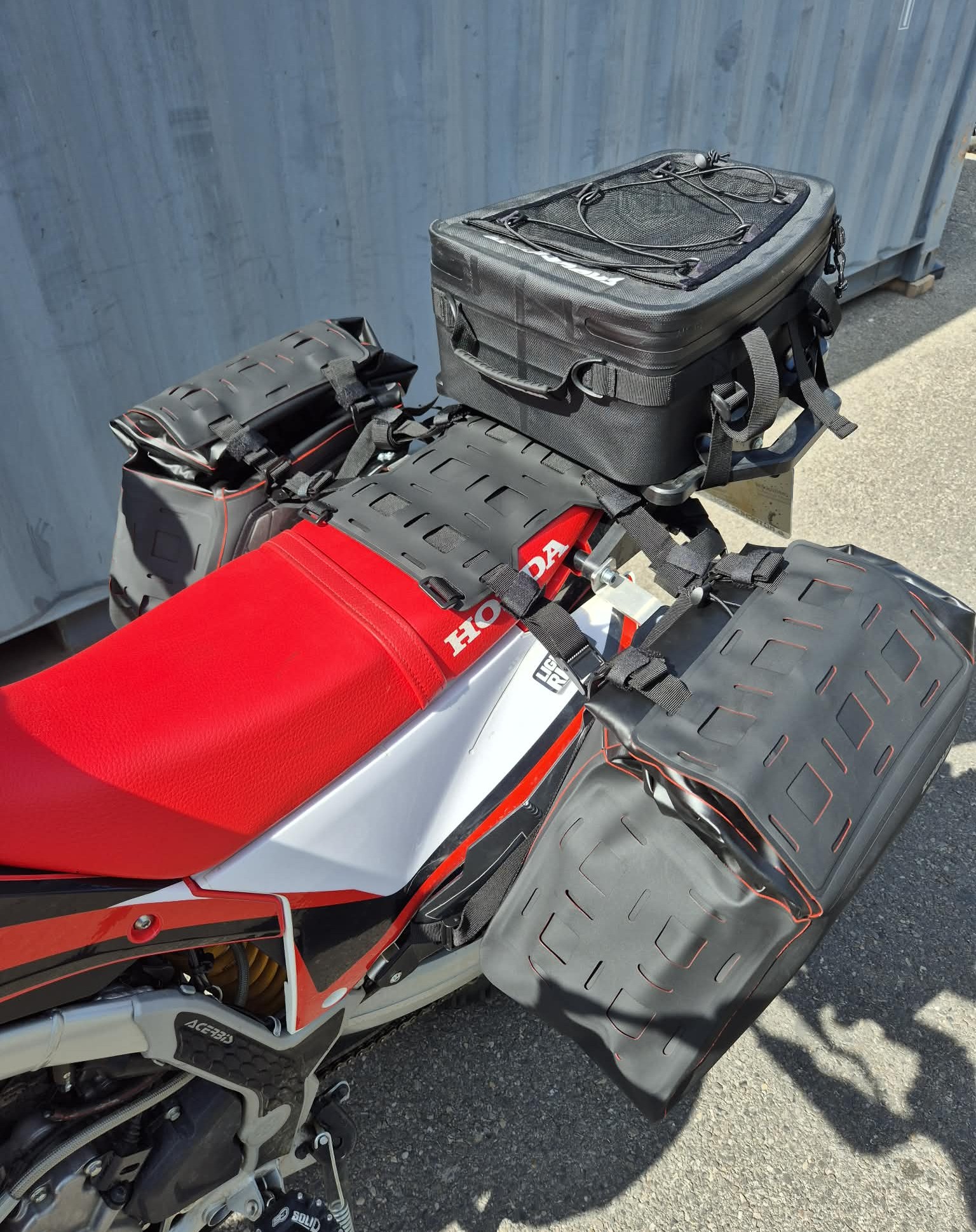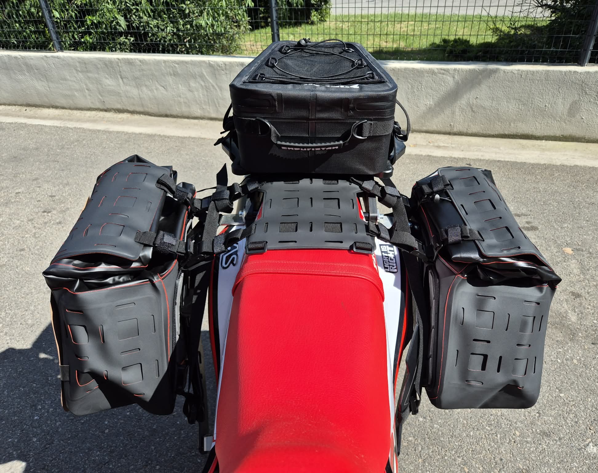 Vous pouvez augmenter individuellement le volume des bagages des sacs en utilisant les sept coussinets de fixation brevetés : trois sur chaque sac et un sur le siège. L’interface du siège est si fine qu’elle ne vous dérange pas pendant la conduite, même lors d’aventures offroad lorsque vous glissez vers l’arrière. Vous pouvez également rouler avec un passager tant qu’aucun sac supplémentaire n’est monté sur le siège !
